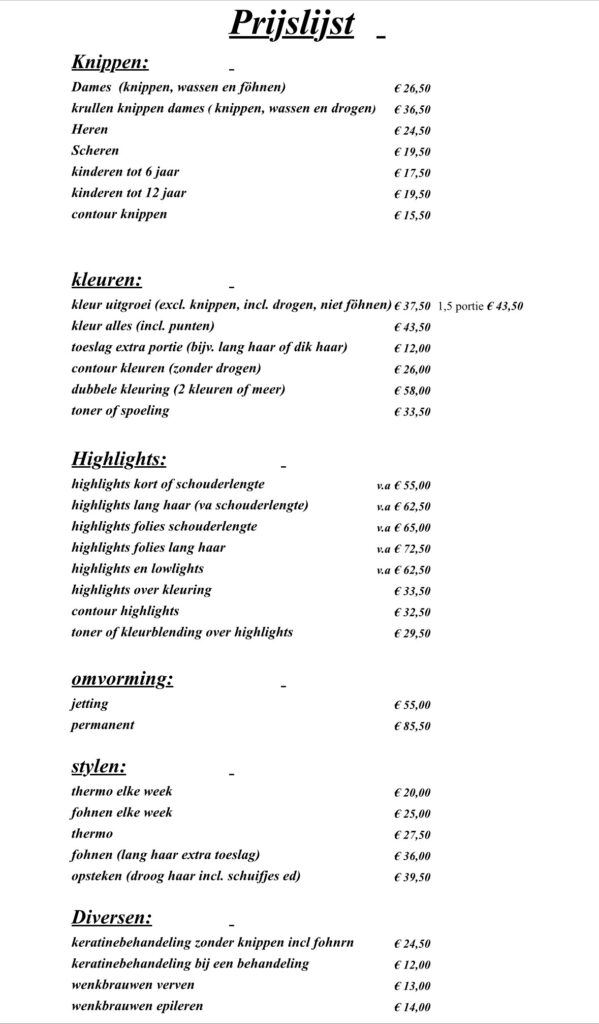 Ik hou van duidelijkheid en overzichtelijkheid. Daarom heb ik een duidelijke prijslijst op de site vermeld. Zo kun je zelf zien welke kosten je kwijt bent. kom je er niet helemaal uit? Bel me dan even of mail je vraag, dan geef ik je zo snel mogelijk antwoord. Soms kan ik niet precies zeggen hoeveel het kost omdat ik dan eerst je haar moet zien en we moeten overleggen wat je precies wil. Kom dan even langs dan bespreken we de mogelijkheden.